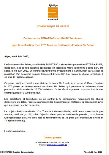 وحسب بيان لمجمع سوناطراك  تحوز “النهار اونلاين” على نسخة من فإن المجمع البترولي قد وقع عقد شراكة  مع الشركة الإيطالية “ماير تكنيمونت” لإنشاء خط ثاني لمعالجة الزيوت ببئر السبع بمنطقة حاسي مسعود.