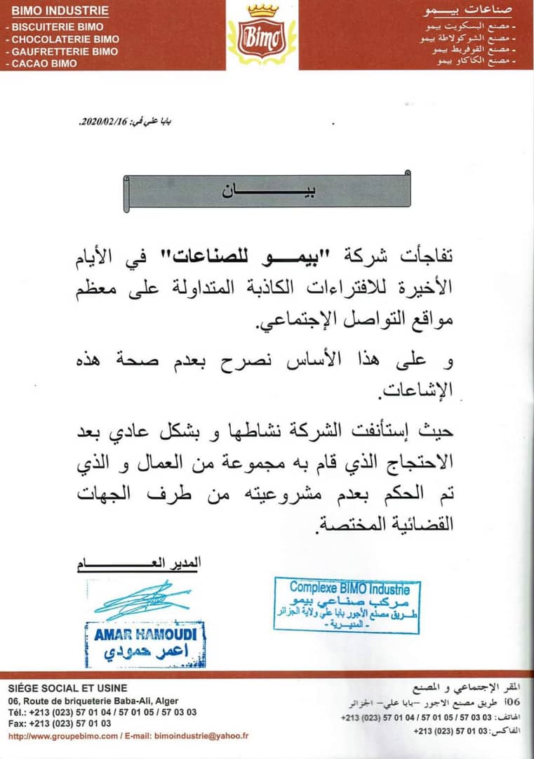 شركة “بيمو للصناعات” تكذب الإفتراء الكاذب بخصوص توقف نشاطها