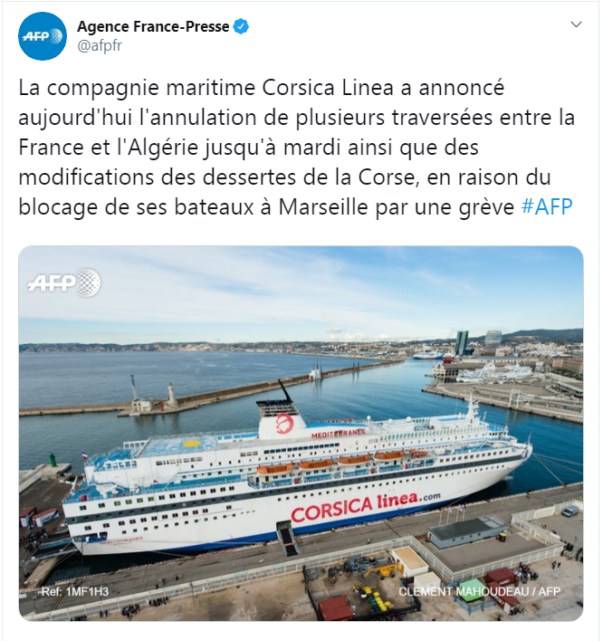 أعلنت شركة كورسيكا لينيا المختصة في الشحن، اليوم السبت، إلغائها للعديد من عمليات نقل البضائع بين فرنسا والجزائر بسبب إضراب العمال بميناء مرسيليا
