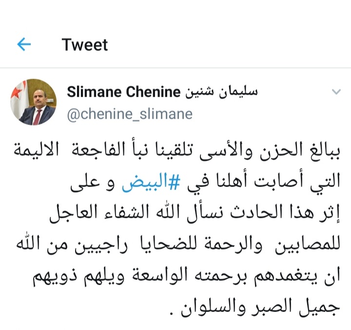ونشر شنين على صفحته الرسمية في تويتر: ببالغ الحزن والأسى تلقينا نبأ الفاجعة الاليمة التي أصابت أهلنا في البيض.
