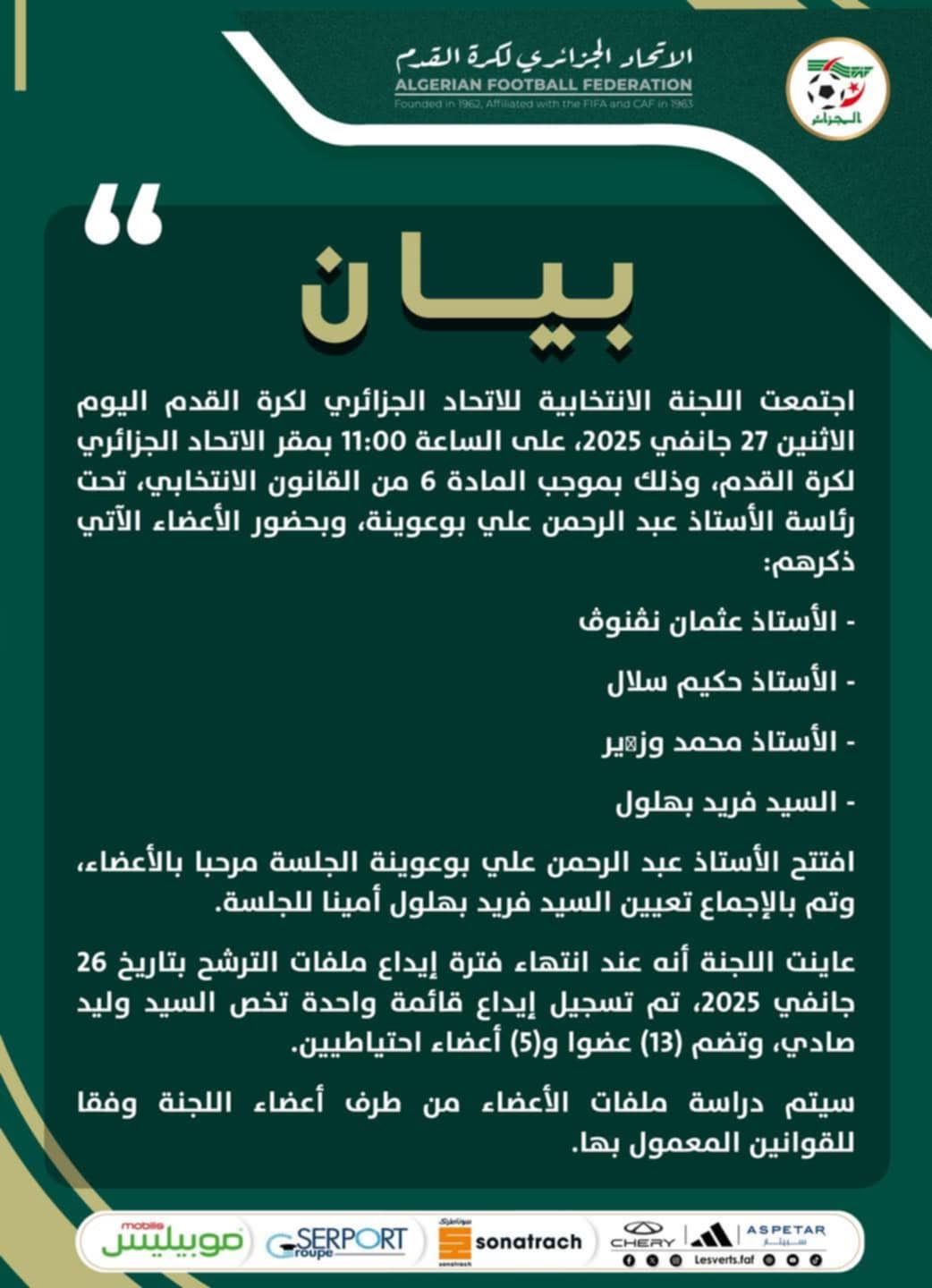 وفي الأخير، أوضحت الاتحادية الجزائرية لكرة القدم، بأن اللجنة الانتخابية. ستقوم بدراسة ملفات الأعضاء، وفقا للقوانين المعمول بها.
