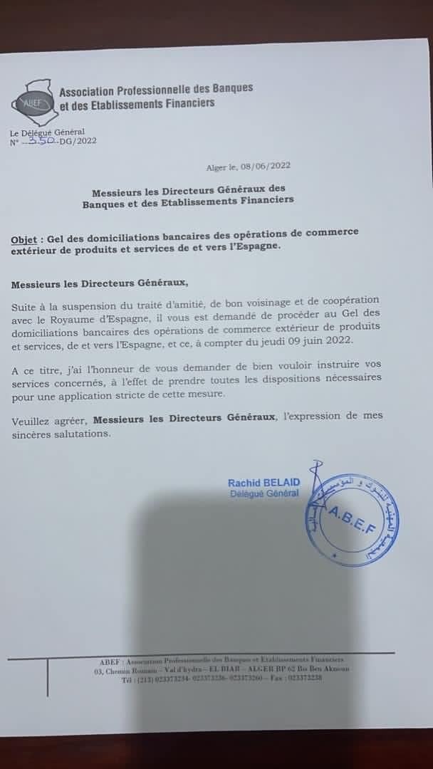 وجهت الجمعية المهنية للبنوك والمؤسسات المالية، اليوم الأربعاء، تعليمة لكافة مديري البنوك، طالبتهم فيها بمنع عمليات التصدير والإستيراد من وإلى إسبانيا.