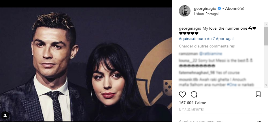 ونشرت “جيورجينا” صورة لها رفقة “الدون” في حفل توزيع جوائز الكرة البرتغالية على صفحتها الشخصية في موقع التواصل الإجتماعي “إنستغرام”.