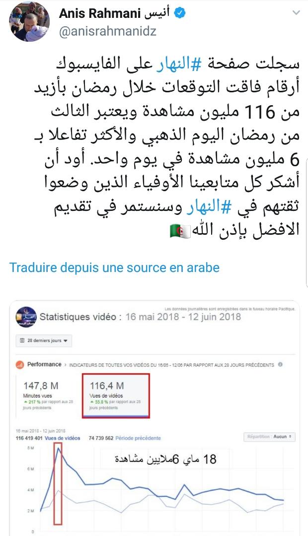 سجلت صفحة “النهار” على “الفيسبوك” أرقام فاقت كل التوقعات خلال رمضان بأزيد من 116 مليون مشاهد.
