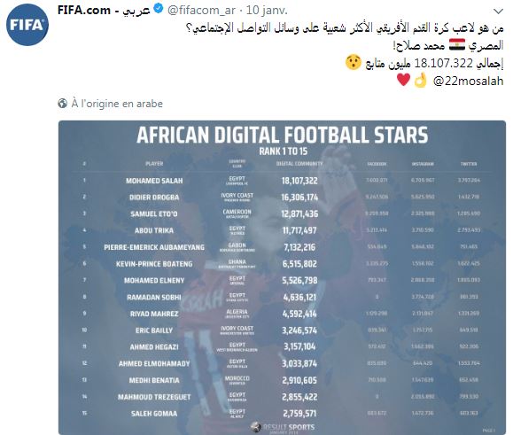 ويُتابع 18.107.322 مليون شخص “صلاح” على مواقع التواصل الإجتماعي بمُجملها مُتفوقا بذلك على النجم الإيفواري “دروغبا” الذي جاء ثانيا.
