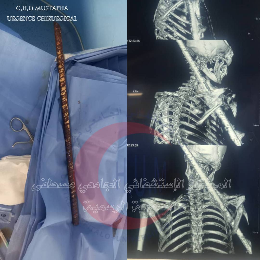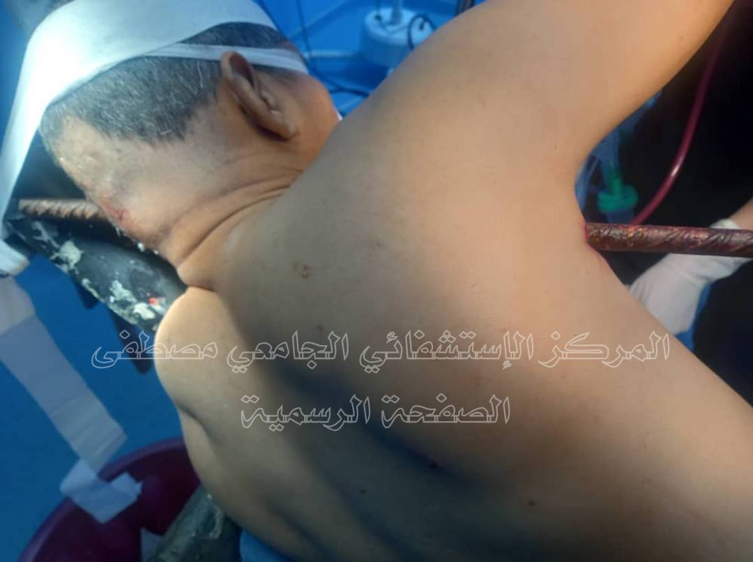 ووصل المريض إلى المستشفى، في حالة جد خطيرة وصادمة، بسبب دخول قضيب حديدي برقبته وخروجه من تحت ذراعه، حيث وصل والقضيب الحديدي مثبت بجسده.