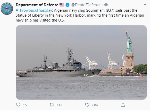 وحسب تغريدة وزارة الدفاع الأمريكية على تويتر، تعتبر هذه المرة الأولى التي تزور فيها سفينة بحرية جزائرية الولايات المتحدة.