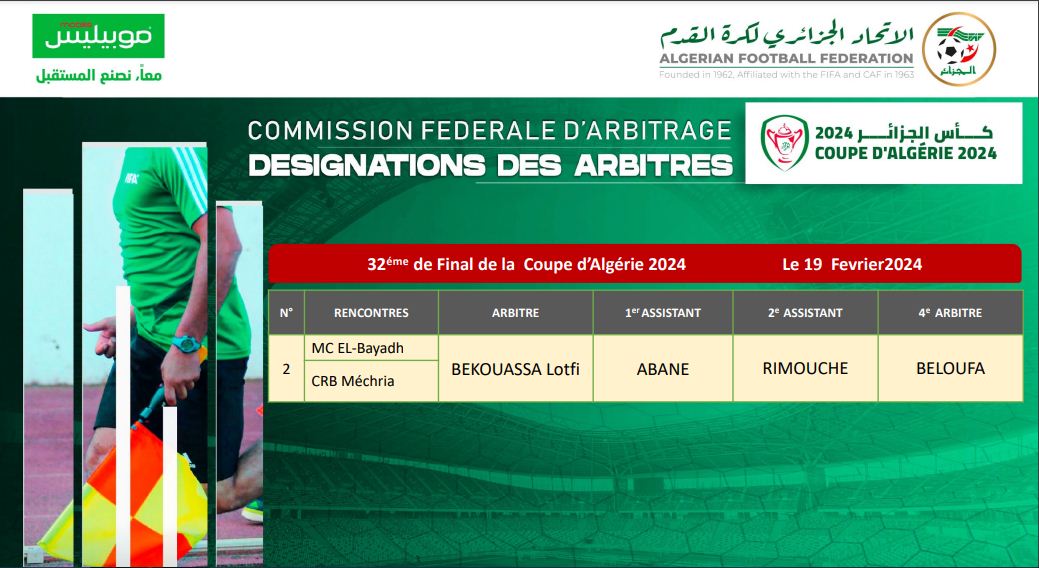 أعلنت الاتحادية الجزائرية لكرة القدم، عن تعيين الحكم لطفي بوكواسة، لإدارة اللقاء المتأخر عن الدور 32 من كأس الجزائر، بين مولودية البيض وشباب المشرية.