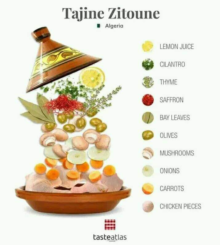 ويعتير طاجين زيتون هو طبق جزائري تقليدي مصنوع من مزيج من قطع الدجاج والزيتون والبصل والجزر والفطر والزعتر وورق الغار وعصير الليمون والزعفران أو الكركم. يتم سلق الزيتون وتجفيفه ، وفي نفس الوقت يتم تحمير الدجاج بالبصل والبهارات.