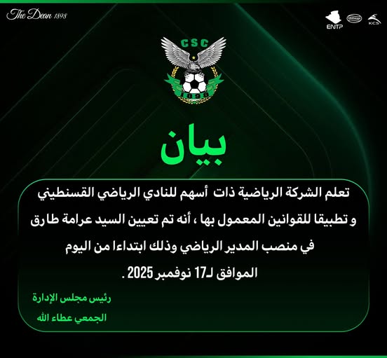 أعلنت الشركة الرياضية ذات أسهم نادي شباب قسنطينة، اليوم الاثنين، عن تعيين طارق عرامة، في منصب المدير الرياضي للنادي.
