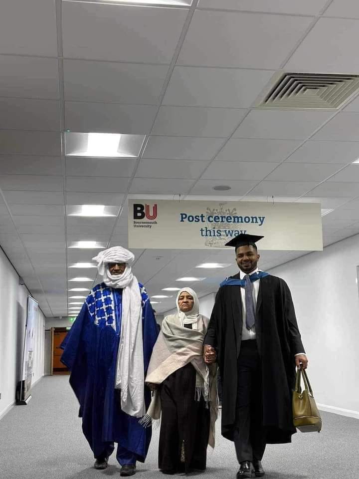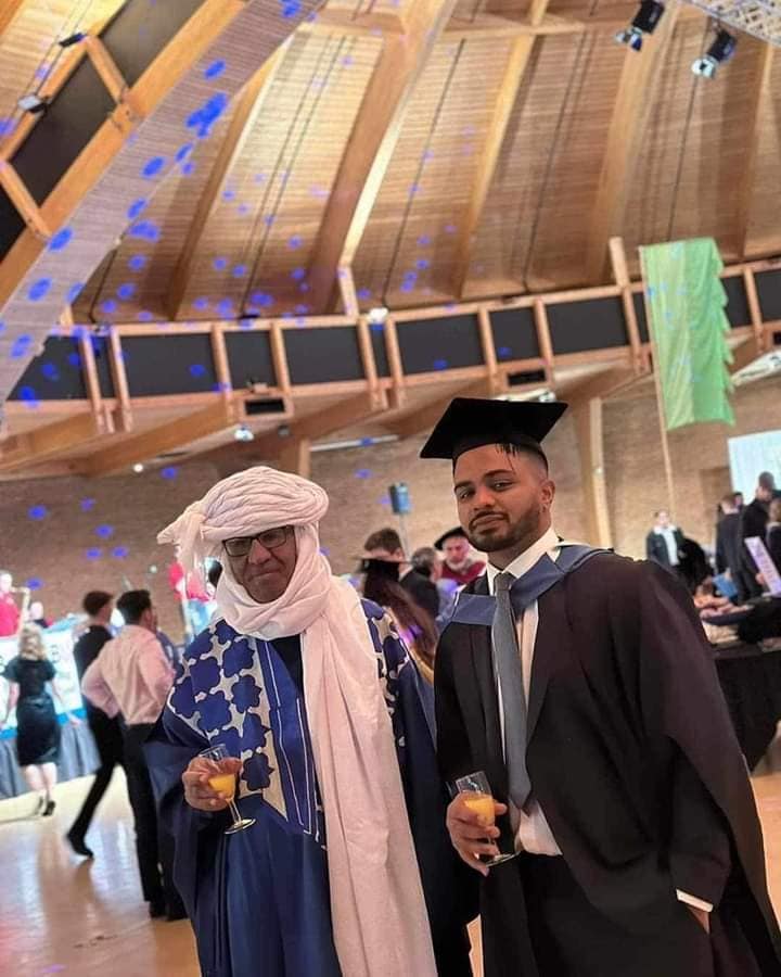 ويظهر الطالب الجزائري باجودة عبد القادر، والذي ينحدر من عين صالح، في الصورة، وهو يرافق والديه بلباسهم التقليدي أثناء تخرجه من جامعة لندن.