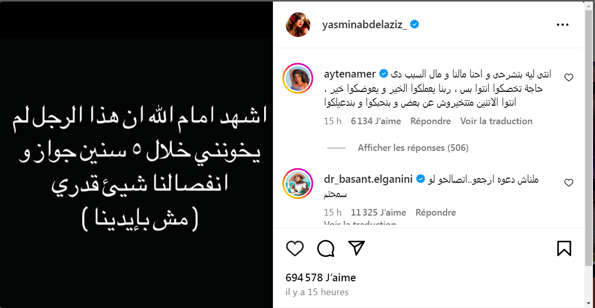 وكتبت ياسمين عبد العزيز على انستغرام: “أشهد أمام الله أن هذا الرجل. لم يخونني خلال 5 سنين جواز وانفصالنا شيء قدري مش بإيدينا”.