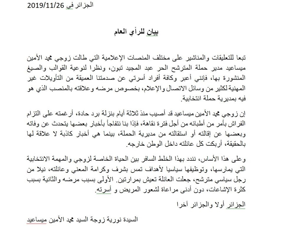 أصدرت زوجة محمد الأمين مساعيد، مدير الحملة الانتخابية للمترشح الحر عبد المجيد تبون، بيانا، وضحت فيه جوانب من مرض زوجها.