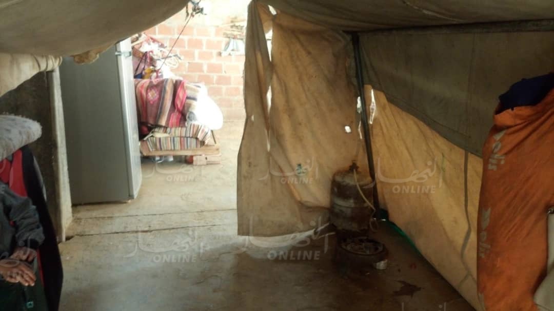 لا يحتوي سوى على سقف فقامت العائلة بنصب خيمة بالية لتقيهم بعض الحر و البرد فحتى قضاء الحاجة يكون في الهواء.