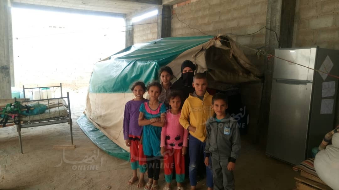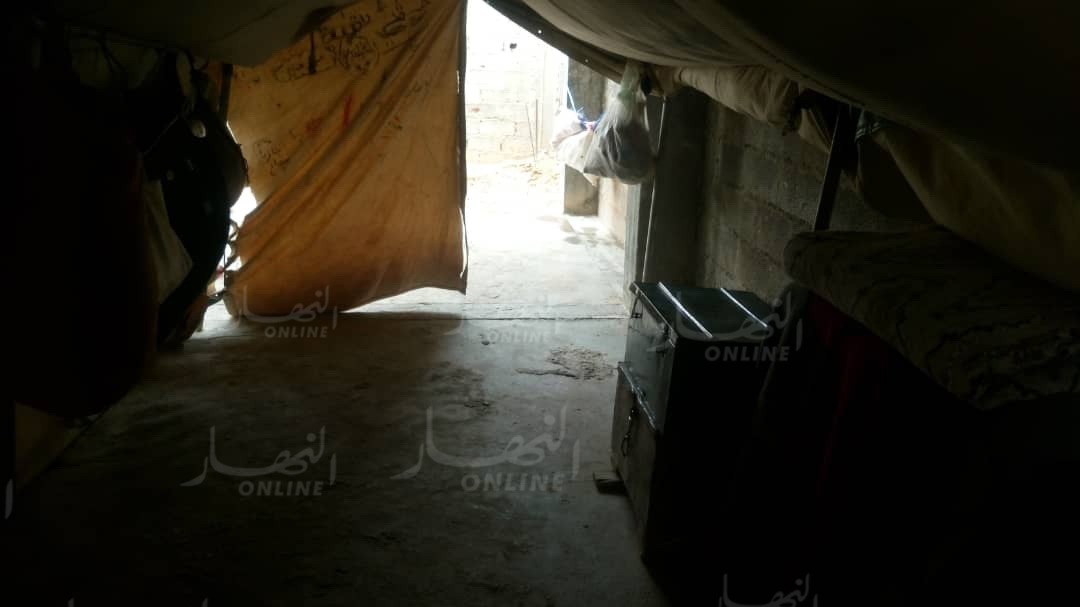 لا يحتوي سوى على سقف فقامت العائلة بنصب خيمة بالية لتقيهم بعض الحر و البرد فحتى قضاء الحاجة يكون في الهواء.