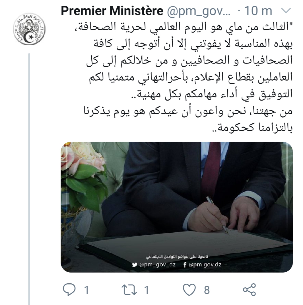 هنأ الوزير الأول عبد العزيز جراد اليوم الأحد، كل الصحفيات والصحافيين بمناسبة اليوم العالمي لحرية الصحافة.