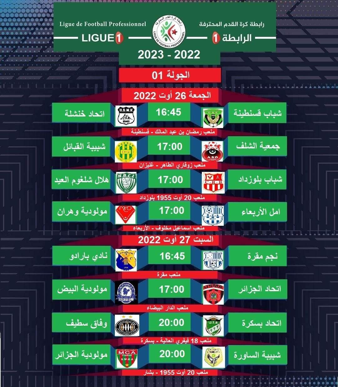 وجاء برنامج الجولة الاولى من البطولة المحترفة 2022-2023 كاملا على النحو التالي: