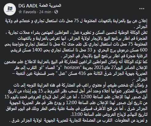 أعلنت الوكالة الوطنية لتحسين السكن وتطويره “عدل“، اليوم الخميس، عن بيع بالمزايدة، 75 محلا ذات استعمال تجاري كل على حدى.