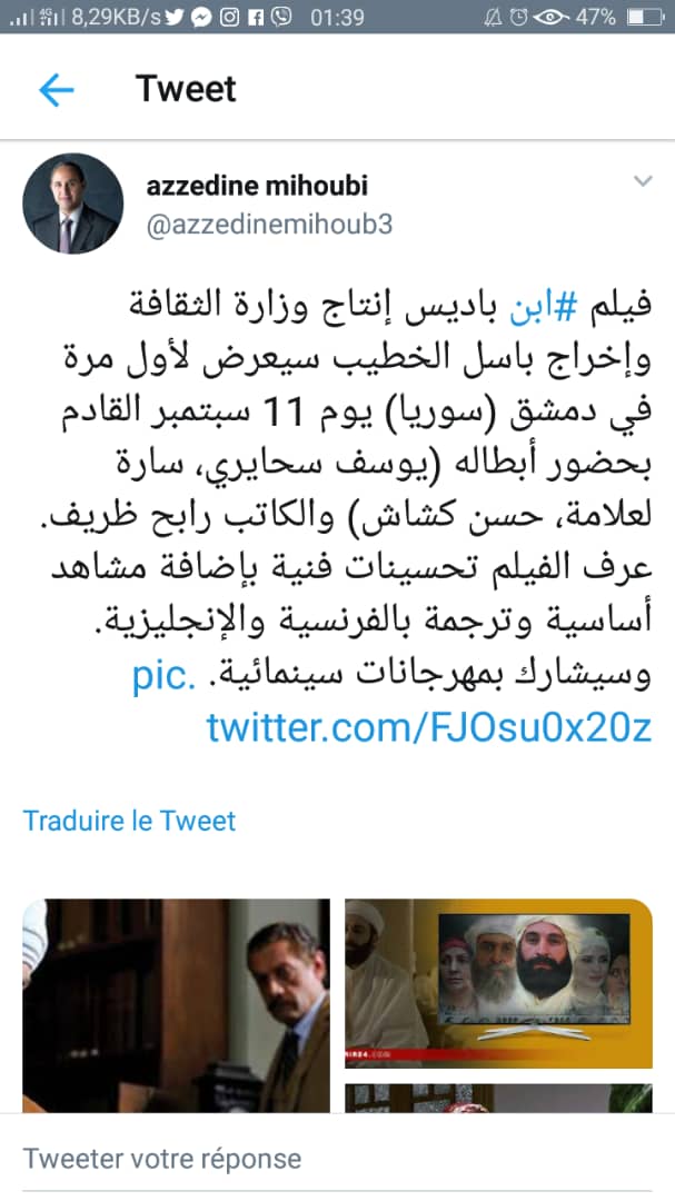 كشف وزير الثقافة عز الدين ميهوبي، أن فيلم “إبن باديس” سيعرض لأول مرة في دمشق “سوريا” يوم 11 سبتمبر القادم.
