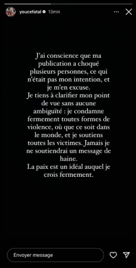 أكد الدولي الجزائري يوسف عطال. لاعب نيس الفرنسي. نبذه كل أنواع العنف عبر العالم. وتضامنه مع المظلومين. مبديا اعتذاره عن منشوره الأخير.
