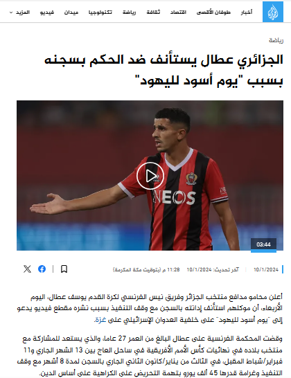 وأكد موقع “الجزيرة نت”، عبر تقرير له، كلام المحامين الذين يدافعون عن قضية مدافع الخضر ضد الفرنسيين، بعدما نشر مقطع فيديو مناهض للكيان الصهيوني.
