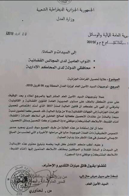 الصادرة امس والتي جاء أنه تم الوقوف على مدى التكفل بالملف على مستوى مديرية الشؤون القضائية والقانونية بعد إسناد قانون المالية لسنة 2017 تحصيل الغرامات الجزائية إلى الجهات القضائية بدلا من وزارة المالية.