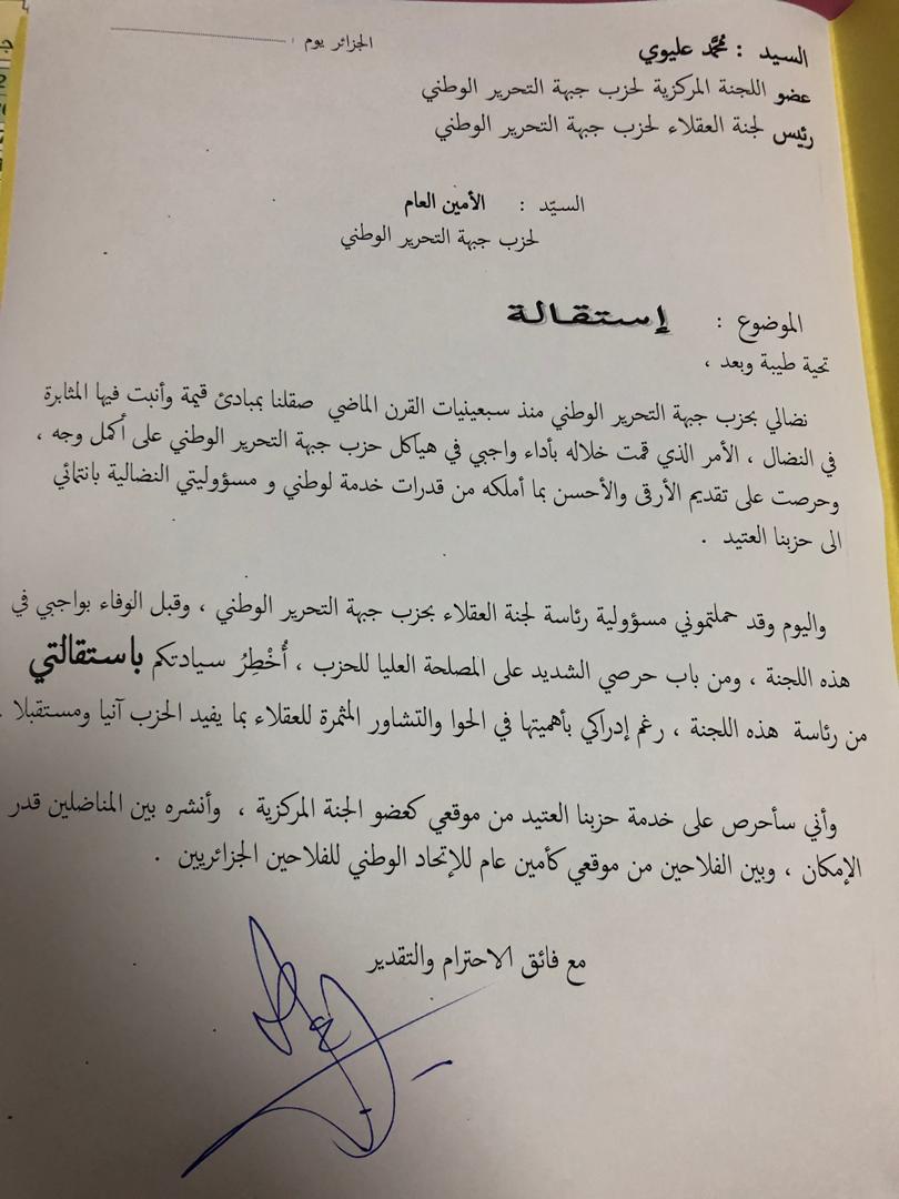 ونشر عضو اللجنة المركزية للافلان بيان لاستقالته من رئاسة لجنة العقلاء، قال فيه انه حرض على تقديم الأرقى والأحسن منذ سبعينيات القرن الماضي للحزب.