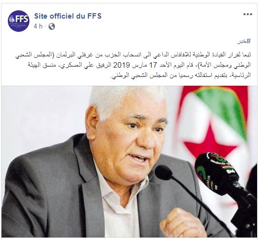 قام اليوم الأحد 17 مارس 2019 الرفيق علي العسكري، منسق الهيئة الرئاسية، بتقديم استقالته رسميا من المجلس الشعبي الوطني.