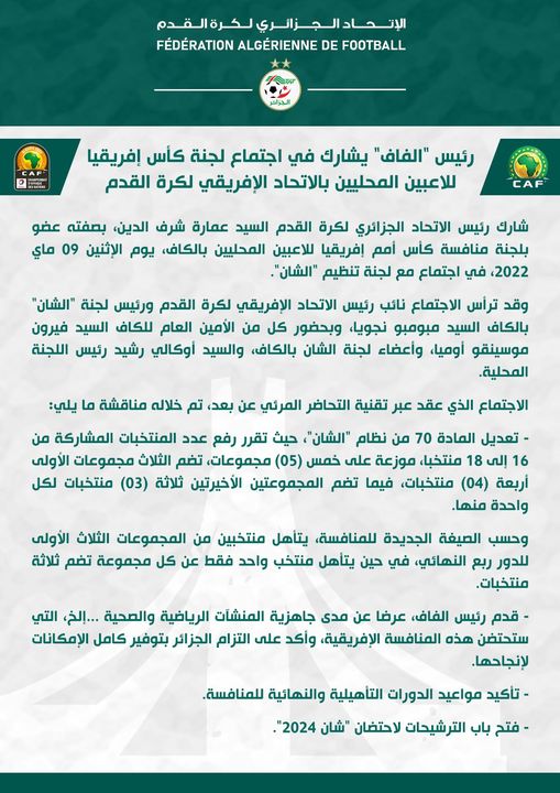شارك رئيس “الفاف”، شرف الدين عمارة، في اجتماع لجنة كأس إفريقيا للاعبين المحليين بالاتحاد الإفريقي لكرة القدم.