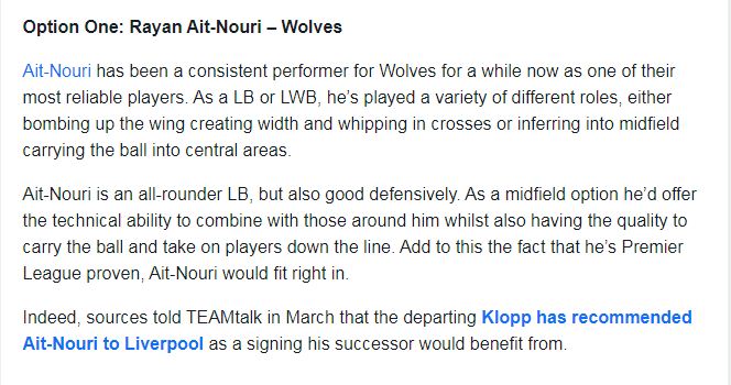 كما ذكر ذات الموقع بالخبر الذي انفرد به شهر مارس الفارط. حينما قال نقلا عن مصادره الخاصة، إن يورغن كلوب، الذي سيغادر ليفربول مع نهاية الموسم المقبل. أوصى بضم آيت نوري، باعتباره توقيعًا سيستفيد منه خليفته.