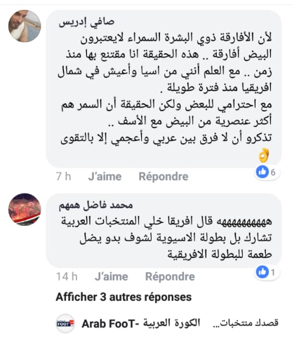 وعلق أحدهم قائلا:”قال إفريقيا؟ دع المنتخبات العربية (يقصد شمال إفريقيا) تشارك في البطولة الآسيوية لنرى إذا بقي للبطولة الإفريقية طعم”.