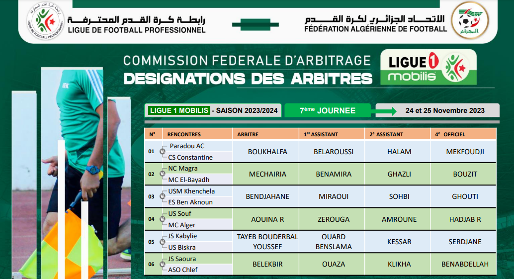 كما كشف الاتحاد الجزائري لكرة القدم، عبر موقعه الرسمي، باقي تعيينات حكام مباريات هذه الجولة، والتي جاءت كاملة على النحو التالي: