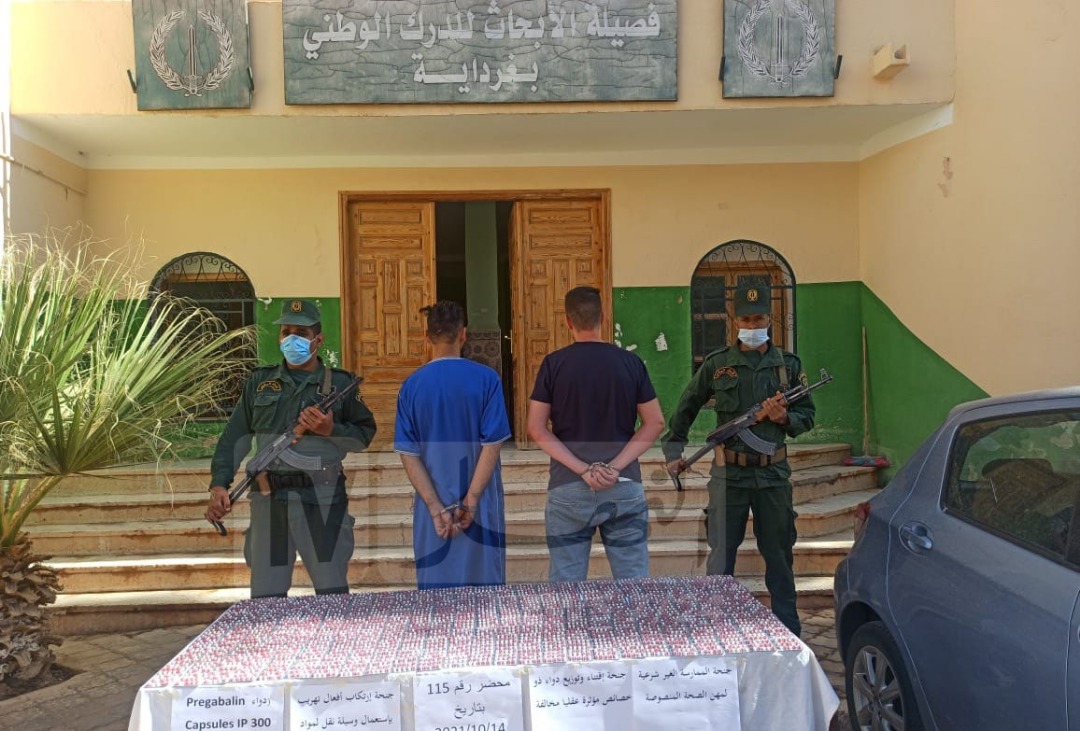 العملية تمت بعد ورود معلومات مؤكدة ونصب كمين محكم أفضى الى توقيف المهرب وحجز المهلوسات. وحسب النقيب زيبوش محمد ممثل المجموعة الإقليمية للدرك الوطني بغرداية فان العملية مكنت من توقيف سيارة مشتبه بهم إثنين. وبعد تفتيشها تم العثور على 5850 كبسولة بريغابالين” 300 ملغ مع توقيف شخصين مشتبه بهما. ليتم التحقيق معهم و تحويلهم الى العدالة بعد إستيفاء الإجراءات القانونية اللازمة وإعداد محضر قضائي.