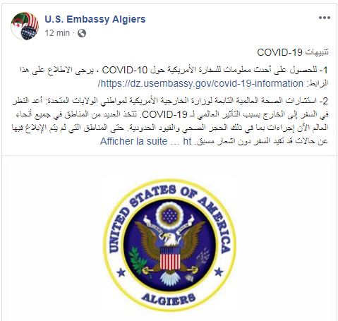 أعلنت السفارة الأمريكية إغلاق المركز الثقافي الأمريكي في الجزائر ابتداء من يوم الأحد 15 مارس وإلى غاية إشعار آخر.