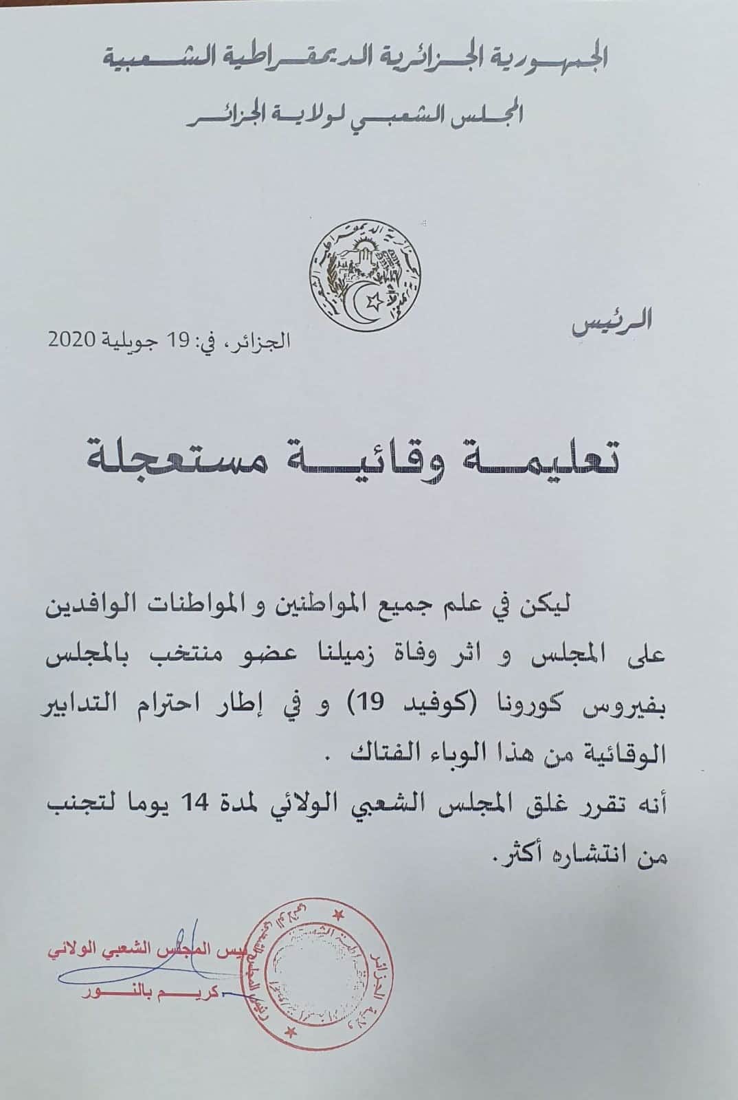 اصدر رئيس المجلس الشعبي الولائي لولاية الجزائر تعليمة بغلق مقر المجلس الشعبي الولائي للعاصمة 14 يوما.