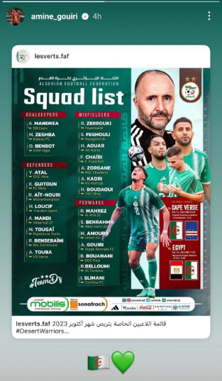 وقام نجم الدولي الجزائري، ونادي رين، باعادة نشر قائمة اللاعبين المعنيين بتربص الخضر، عبر حسابه الرسمي على “انستغرام”.