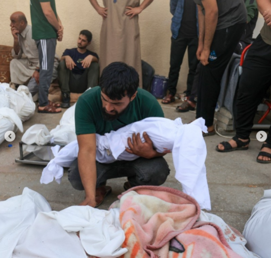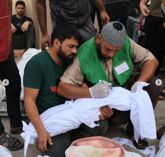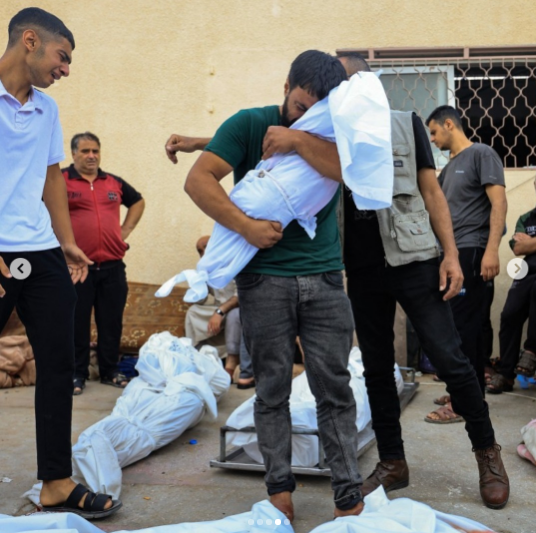 نشرت وكالة أ ف ب، صورا مؤلمة تُظهر ردة فعل أب فلسطيني وهو يحمل جثة طفلة المكفنة، أمام مشرحة مستشفى الأقصى في دير البلح وسط قطاع غزة.