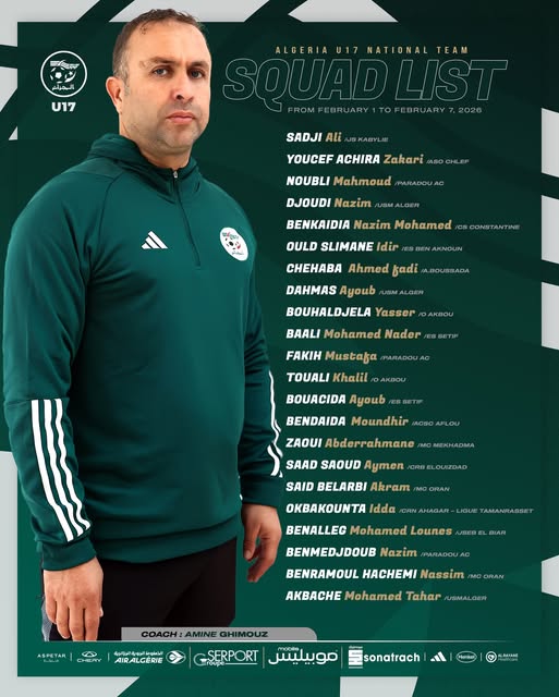 أعلن الاتحاد الجزائري لكرة القدم عن قائمة لاعبي المنتخب الوطني لأقل من 17 سنة المعنيين بالتربص التحضيري المبرمج بالمركز التقني الوطني بسيدي موسى، خلال الفترة الممتدة من 1 إلى 7 فيفري الجاري.