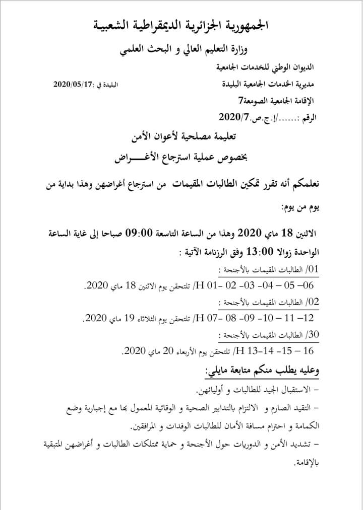 وفي تعليمة من مديرية الخدمات الجامعية بالبليدة موجهة لمصلحة الاعوان بالإقامة الجامعية بالصومعة 7، فقد تقرر تمكين الطالبات المقيمات من استرجاع أغراضهم بداية من يوم الإثنين على الساعة التاسعة إلى غاية الساعة الواحدة زوالا.