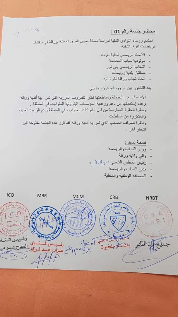 وجاء في البيان أن أندية ورڨلة تعيش ظروفا مزرية، ورغم وجود مؤسسات بترولية في المنطقة، إلا أنها لم تستفد منها في شيء.