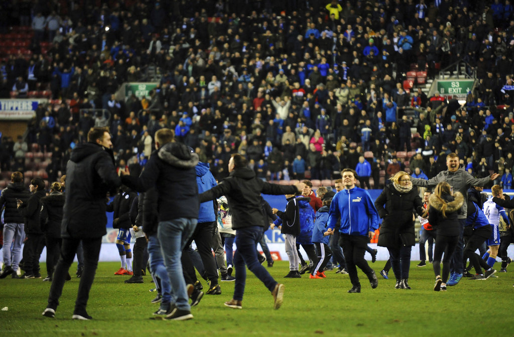 ومع نهاية المباراة اجتاح مشجعو “ويغان” أرضية الميدان فرحين بالتأهل للدور المقبل من كأس الإتحاد.