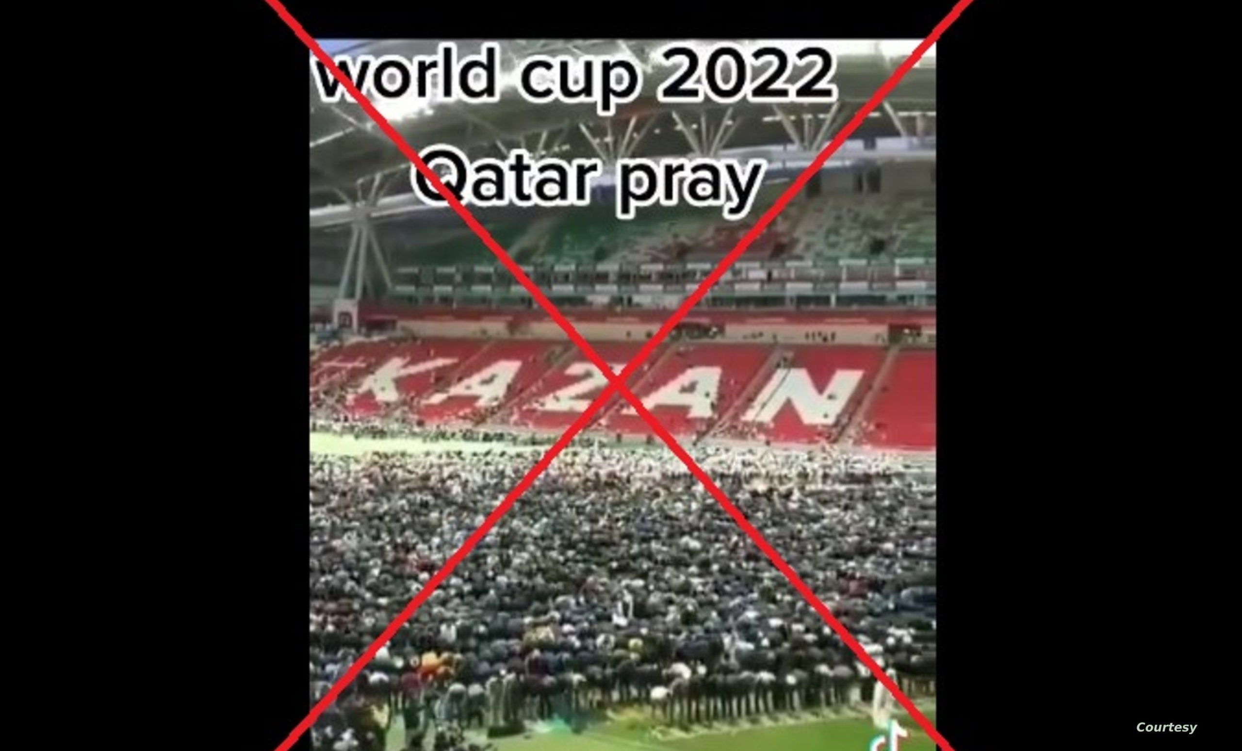 ويُظهر من خلال مقطع الفيديو مئات الأشخاص يؤدون الصلاة في ملعب كرة قدم. مع تعليقات تفيد بأنه يعود لأحد ملاعب كأس العالم بقطر الحالية.
