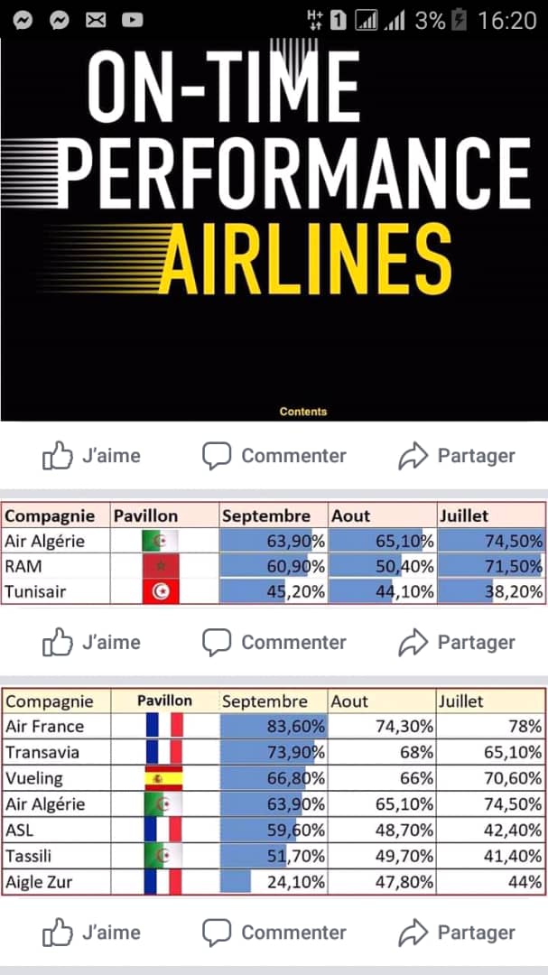 وحسب ذات النتائج فقد أحتلت الجوية الجزائرية المكانة الأولى على المستوى الإقليمي و الذي ضم شركات الطيران لدول المغرب العربي ، من خلال نسبة 67 بالمائة في إحترام مواعيد إقلاع ووصول الرحلات.