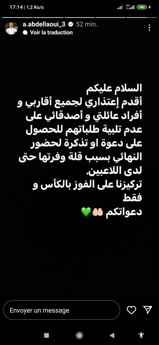 كما أوضح: “أعتذر لعدم تلبية طلباتهم من أجل الحصول على تذكرة لحضور مباراة النهائي بسب قلة وفرتها حتى لدى اللاعبين”.
