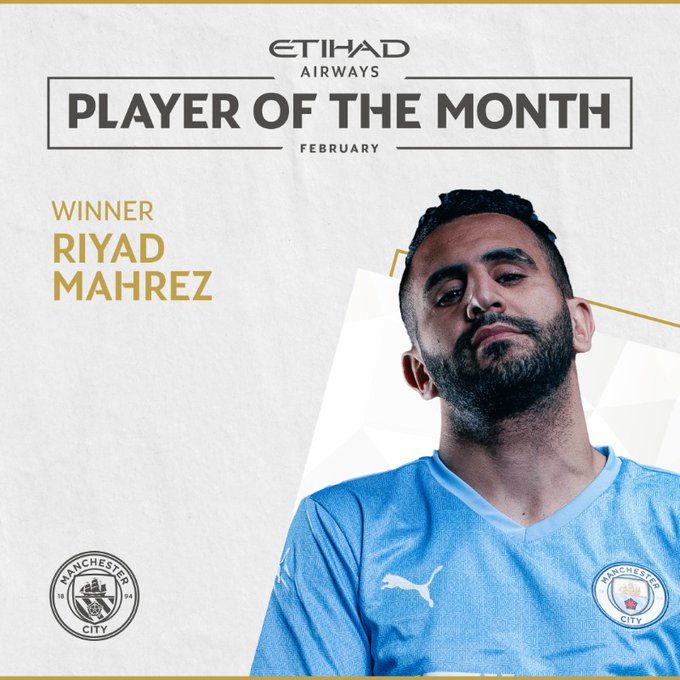 أختير الدولي الجزائري رياض محرز لاعب الشهر في فريقه مانشيستر سيتي بعد تألقه اللافت للانتباه في فيفري الماضي.