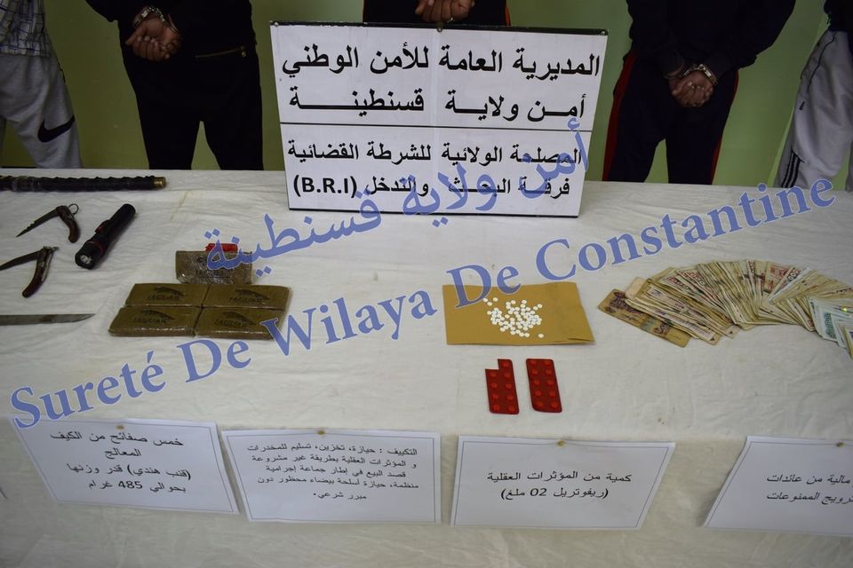 العملية التي قادتها فرقة البحث و التدخل بأمن ولاية قسنطينة كللت بحجز كمية من المخدرات قدرت بعد وزنها بـ 485 غ، 81 قرص من دواء ريفوتريل، أسلحة بيضاء متنوعة و مبلغ مالي.