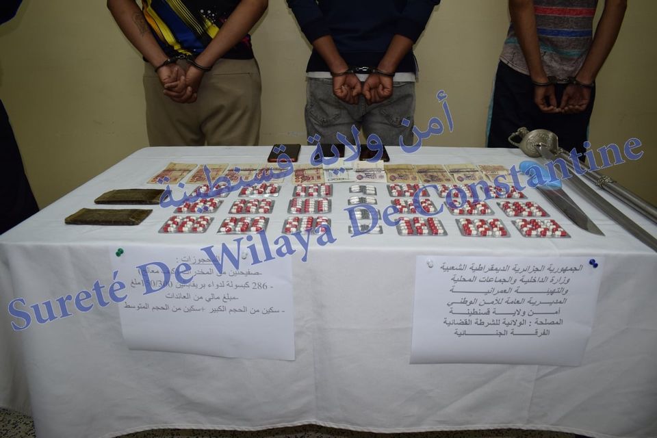 وتمكنت مصالح أمن ولاية قسنطينة من معالجة قضية تتعلق بحيازة المؤثرات العقلية والادوية ذات الخصائص المخدرة لغرض البيع ، حيازة اسلحة بيضاء دون مبرر شرعي .