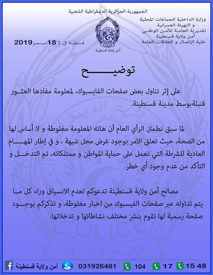هذا وقد فنذت كديرية امن ولاية قسنطينة من وجود قنبلة وكل ماتم تداوله عبر صفحات الفيسبوك اخبار مغلوطة .