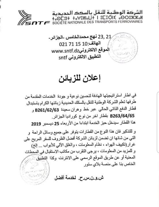 أعلنت الشركة الوطنية للنقل بالسكك الحديدية عن إستبدال قطار الدفع الذاتي الحالي عبر خط وهران سعيدة بآخر من من نوع كوراديا الجزائر.