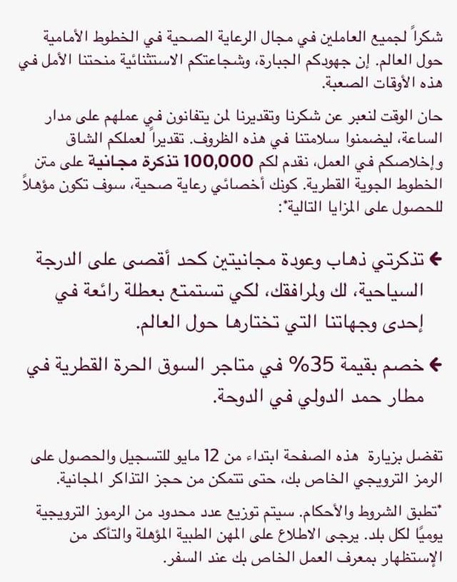 منحت الخطوط الجوية القطرية مئة ألف تذكرة سفر مجانية للصفوف الأمامية لمحاربي فيروس كورونا من كوادر طبية كمبادرة شكر و عرفان لمجهوداتهم في محاربة الفيروس.